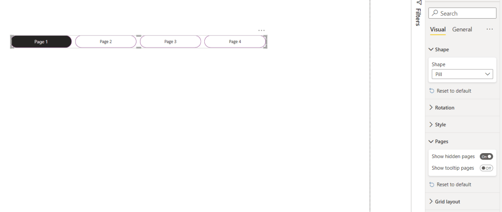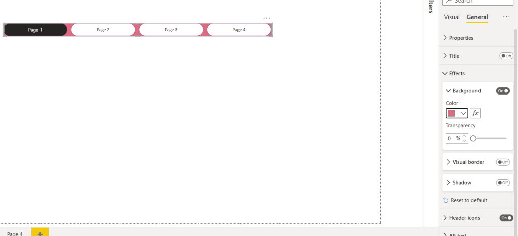 Also, there are options to design the visual by changing items in effects, default, color, or each type of design you like for the report. The benefit of this approach is that once you remove one page, it will automatically hide the item with the name of that page inside the visual. For example, I removed Page 4.
