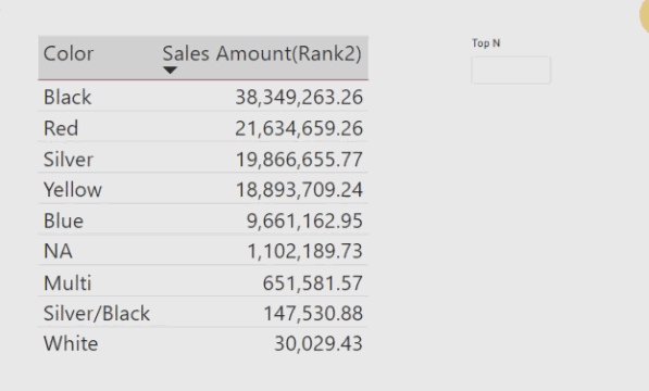 The parameter code gives me a single-column table with different N values from 1 to Max non-blank values that I need for TopN. The “Color” column has 10 distinct values.