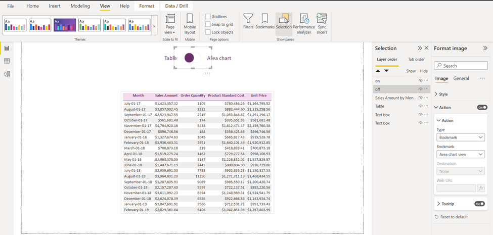 Go to format image>> action >> bookmark type then select “Area chart view”, that is all we need to do for this toggle. Next, once you press Ctrl+Left-Mouse Click on the toggle; you will go to the “Area chart view”.