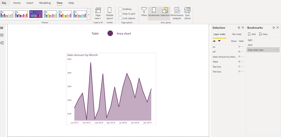 Next, we should prepare all visuals that we need for our page for both sides. For example, in this demo I am showing two views; one table view and another for area chart view. I want to show the table when the toggle is pointing towards the table and show the area chart, when the toggle is pointing towards the area chart.